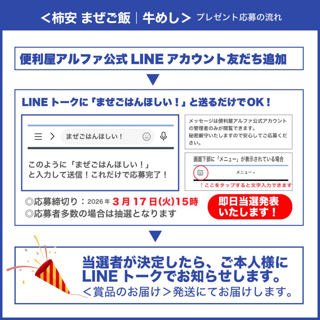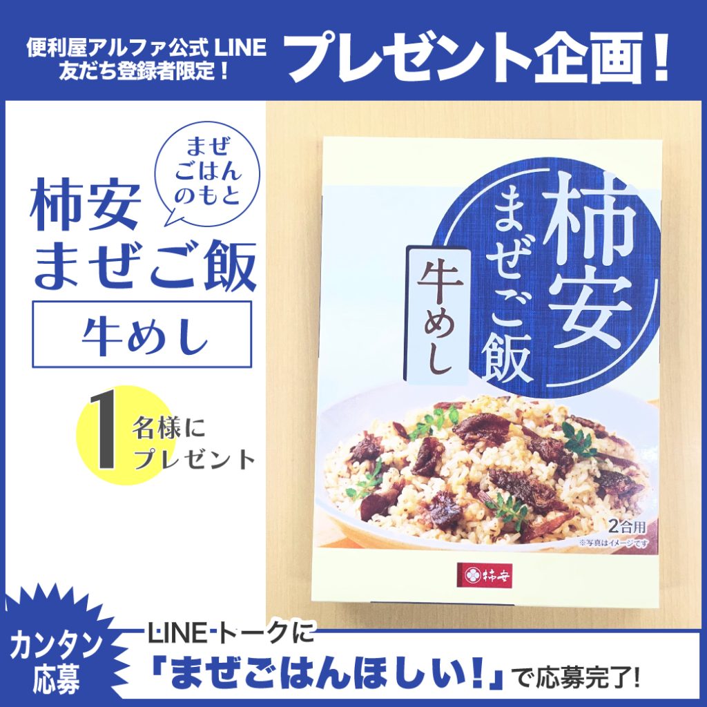 応募はカンタン! 便利屋アルファ公式LINEアカウントに友だち追加して トーク画面に 「まぜごはんほしい!」 と送信するだけで 応募完了! 便利屋アルファ公式LINEアカウントに友だち追加は こちら から
