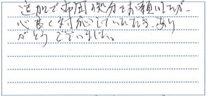 「3箇所ともきれいにしていただけました」とお喜びいただき、たいへん嬉しく思っております。また、追加の処分作業もありがとうございました。