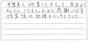 また、作業の早さや手際の良さにつきましてもご満足いただけたとのお言葉を頂戴し、スタッフ一同、大変うれしく思っております。