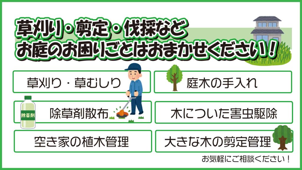 草刈り、剪定、伐採から除草剤散布、防草シート施工まで、お庭のあらゆるお困りごとに対応いたします。